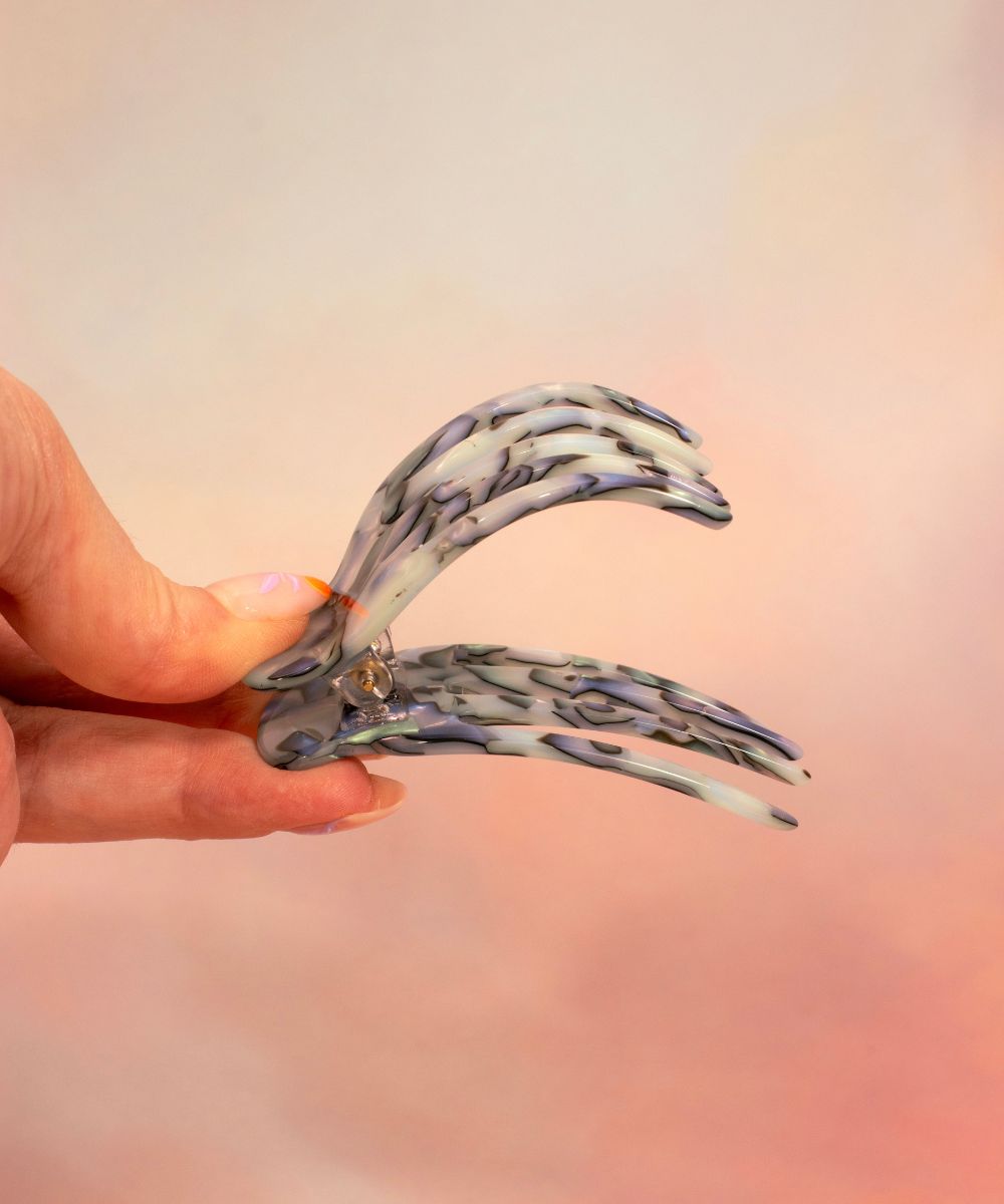 They are handcrafted in France with laser-cut cellulose acetate and a strong steel clasp, making them a durable alternative to flimsy, plastic hair claws.