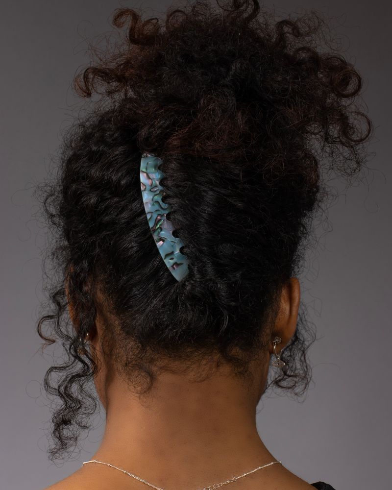 Looking to create quick, easy, and timeless hairstyles? We have a range of hair combs that are perfect for curly hair! Our 12cm French Pleat Comb features both straight and waved teeth, which will work with your curl pattern to provide long-lasting, secure hold. Flip your hair up into a French twist, run the comb through your hair, and push it back in on itself to secure, just like you would with a bobby pin! This creates an effortless, elegant style that holds all day long. If you like the side-swept look, then try our Large and Small Thick Hair Side Combs, or our beautiful, handmade 8cm Side Comb. These look beautiful worn to the side of the hair, and created a snatched, lifted look by drawing the eye upward. For something eye-catching, try out 2x Interlocking Combs. These are gorgeous in a half-up style, and their waved teeth work very well in curly hair. Whatever your hair length or curl pattern, we have the combs for you. Not sure where to start? Get in touch here.