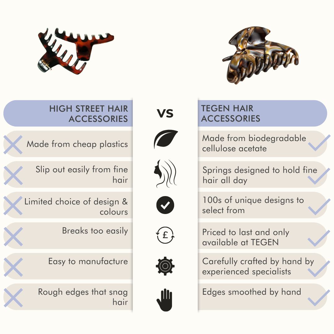 We have been working closely with our small family team in France for over ten years to perfect our accessories, fitting them with the best quality clasps and ensuring the smoothest edges to prevent hair damage. A great hair accessory protects your hair from damage and supports it for as long as required, which is of the utmost importance to us here at Tegen Accessories.